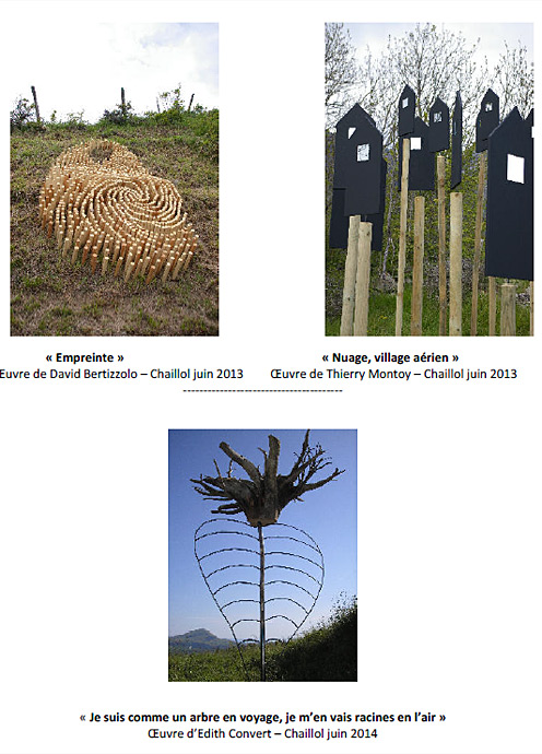 Cinq installations plastiques (voir photos ci-dessous) sont d’ores et déjà présentes sur le sentier,fruit de 4 éditions précédentes : Nous nous aimons tant #3(2008), Orée d’un pays (2012), Empreinte (2013)et Nuage, village aérien (2013), Je suis comme un arbre en voyage, je m’en vais racines en l’air (2014).