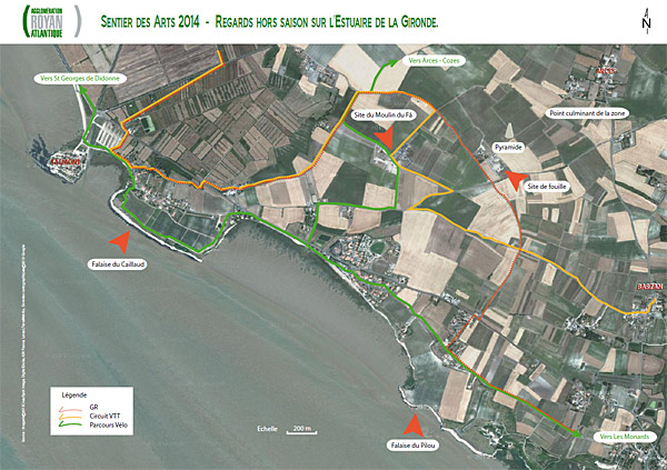 La seconde édition 2014 des Sentiers des Arts - Regards hors saison sur l’Estuaire de la Gironde met l’accent sur le patrimoine paysager et historique du Sud de son territoire, toujours avec la volonté de valoriser des itinéraires de type Land art, et art environnemental et puise son originalité dans la présentation d’oeuvres éphémères le long d’un parcours qui domine le plus majestueux Estuaire d’Europe, entre les communes de Talmont et Barzan.